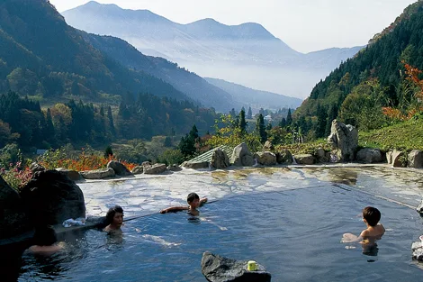 Desde allí, un agradable paseo te lleva a Sainokawara, que no es un onsen convencional, sino una experiencia monumental. Imagina un parque nacional donde el río que fluye es agua termal caliente. En el centro de este valle se encuentra una de las piscinas al aire libre más grandes de Japón, con una superficie de 500 metros cuadrados. La inmensidad del lugar permite que, incluso cuando hay mucha gente, puedas encontrar tu propio rincón de paz rodeado de bosque. Es la fusión perfecta entre senderismo ligero y baño termal.