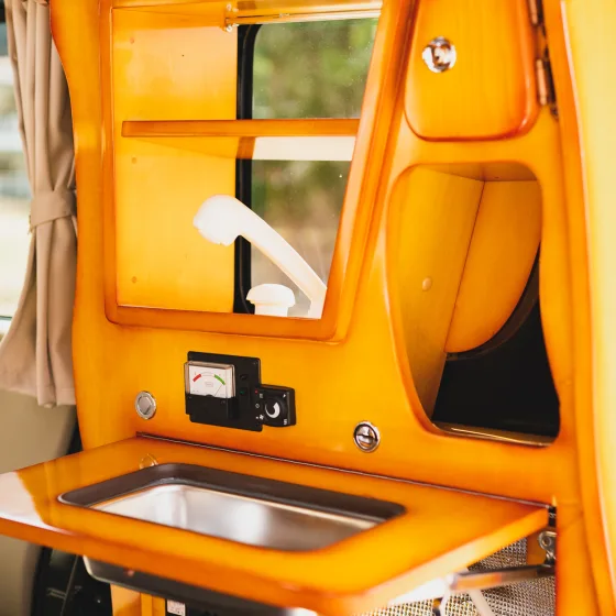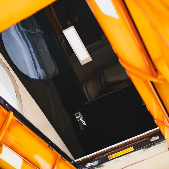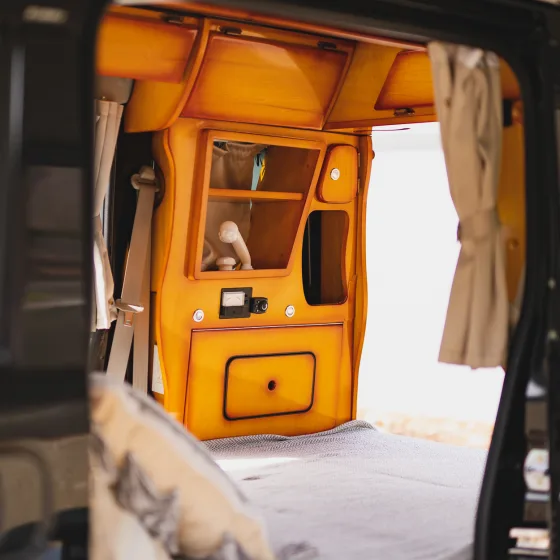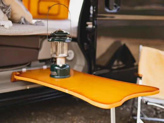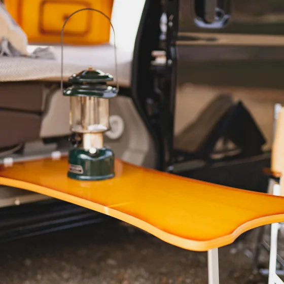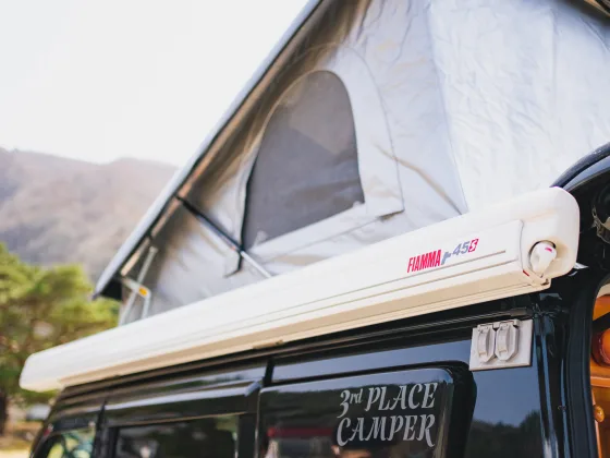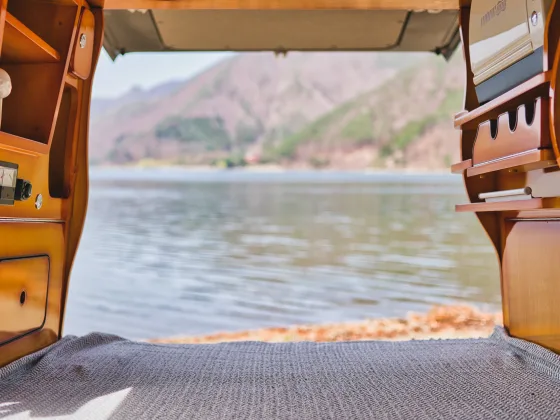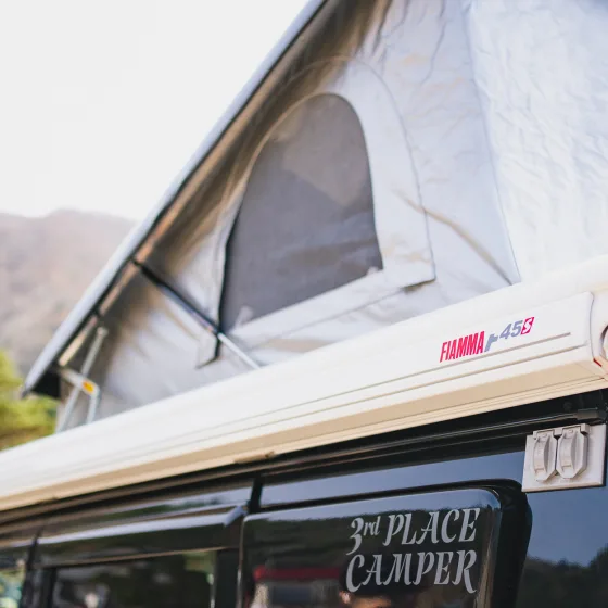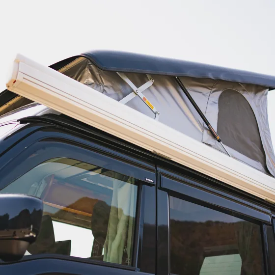 Car navigation system / ETC on-board unit / Rear view monitor / Driving charging system / Sub battery (55A) / 40W solar panel / 2000W inverter / 100V external input and output outlets / 12V socket / Removable center table / Overhead cabinet / Snack table / Sleeping mat and Mini cushion / Pop-up roof / Sub-battery volt meter / Water supply and drainage tank set (with butterfly sink) / Battery charger / FF heater / Side awning (FIAMMA 2.5m) / Under-floor storage / Curtains / Battery level gauge with over-discharge protection function / Microwave oven / Microwave oven, TV, Drive recorder, Stowable galley, Under-floor storage, Curtains, Battery gauge with over-discharge protection, TV