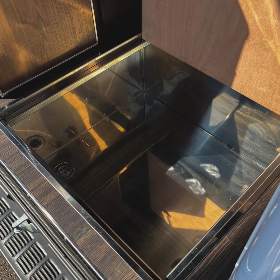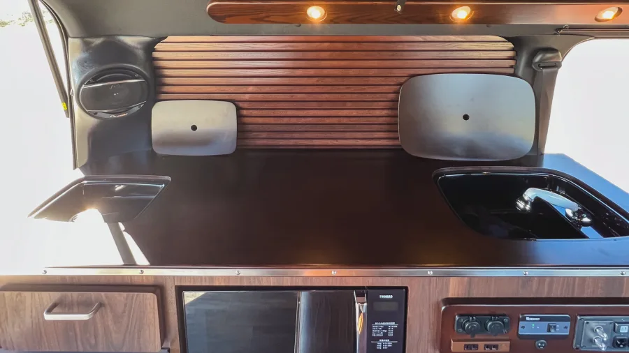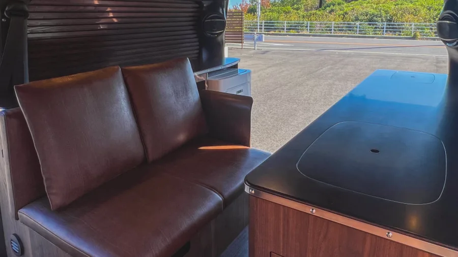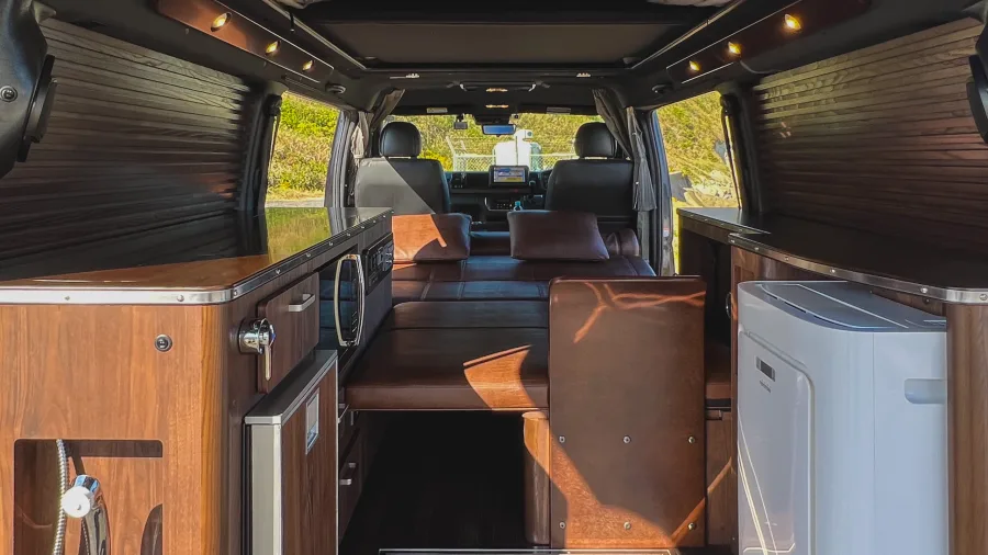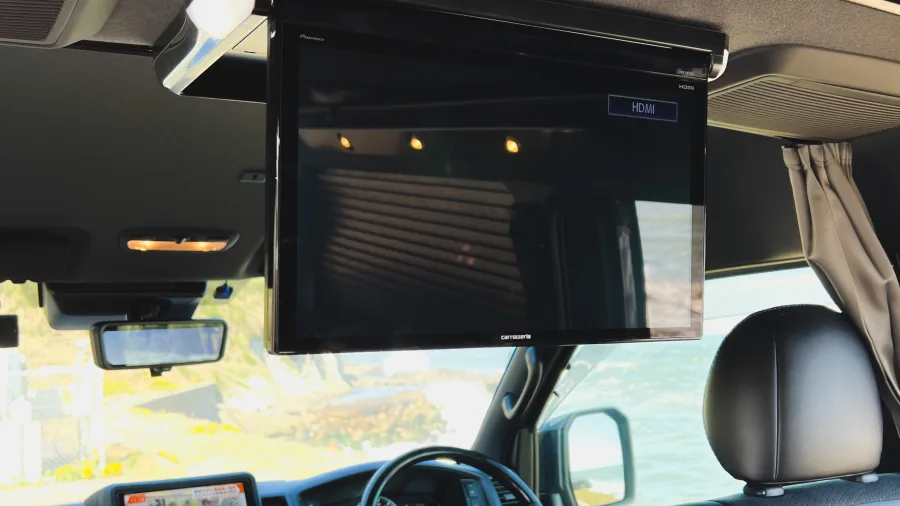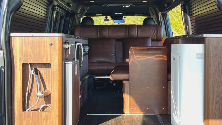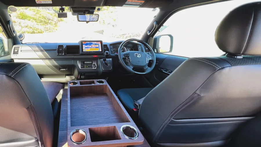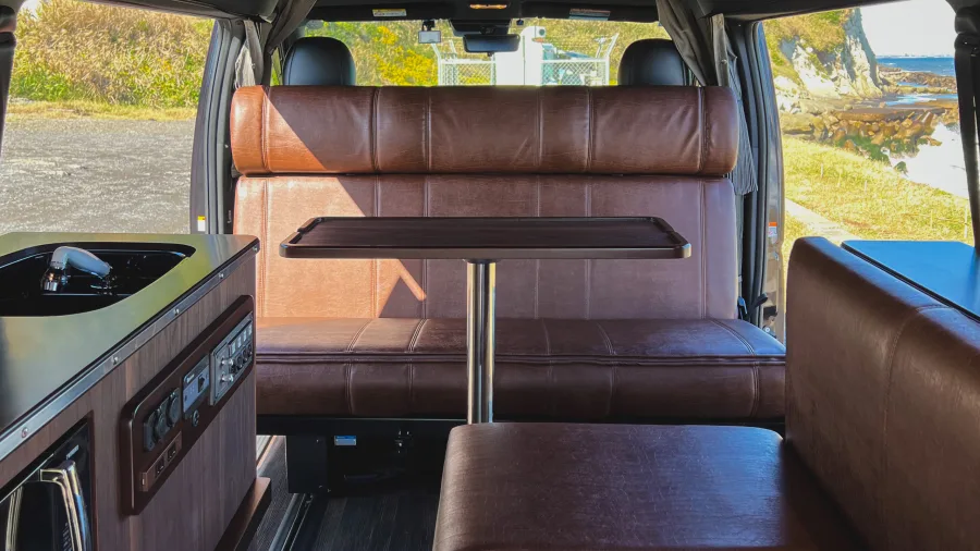 ETC on-board unit / 9-inch navigation system / Drive recorder / Pop-up roof / Pure Japanese handmade furniture (solid top panel) / Second seat REVO1400 (FWS molding) / Lithium-ion sub-battery 510 Ah (170 Ah✕3) / External power system + sub-battery charger ( External power supply system + sub-battery charger (50A) / 10-liter tank O✕2 / 310W solar panel + charging system (20A) / Removable center table (850✕350) / Running charging system (60A) / W insulation and floor insulation / 2000W inverter (sine wave) / Insulated window films (sliding doors and back doors) O✕2 100 VAC outlets (left furniture, rear passenger seat) / IR-cut film (driver/passenger) / 12 V cigar socket / Original anti-bounce leaf springs / Four switch panels / Four light-shielding curtains / Dimmable LED interior lighting / Under-floor storage / Second seat upper map LED lighting✕2 LED lights on the back door (O✕2), puncture repair kit, microwave oven, FRP sink, Japanese cooler, Webasto 49-liter side-opening refrigerator, USB port✕2, FF heater (Evaspecher), Calmflex sound insulation, sub-battery level meter, Ulvehicle rear additional stabilizer, D-pillar Speakers / Rear quarter panels (both sides) / Main and sub switch / Step LEDs (both sides) / Footlights